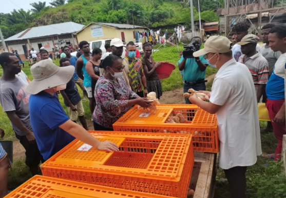 贾金宏(前右)向减贫示范户分发鸡苗