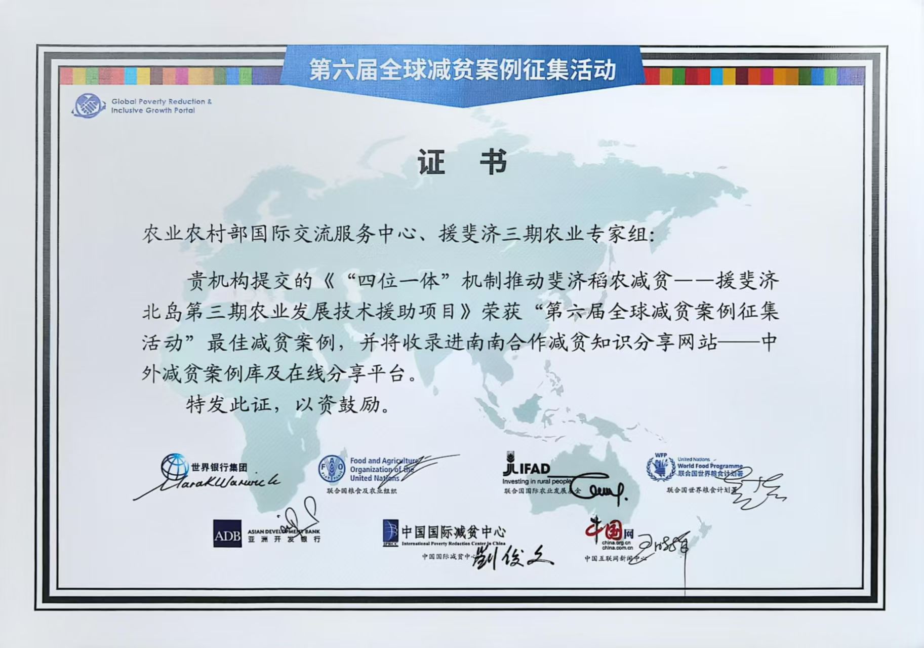 12月10日,由农业农村部国际交流中心(以下简称“国际交流中心”)报送的《“四位一体”帮扶机制推动斐济稻农减贫实践——援斐济北岛第三期农业发展技术援助项目》成功获评“第六届全球减贫案例征集活动”最佳减贫案例。