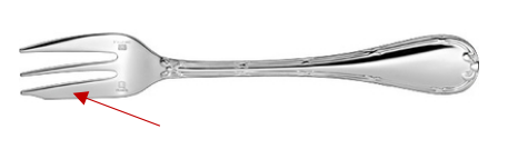 “海绵”质的甜品(不是流质,也不完全是硬的)使用甜品叉子,这类甜品有熔岩蛋糕等。如图,甜品叉子叉齿两边大小不一,这是因为大的一边要用来切甜点。这类叉子通常单独使用。