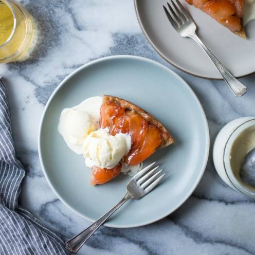 How to eat it? There is one rule for eating Tarte Tatin, it must be served warm, like this, the cream melts on contact. Fork, knife and spoon are needed for eating this particular dessert: fork and knife for the tart and the spoon for the vanilla cream or ice-cream.