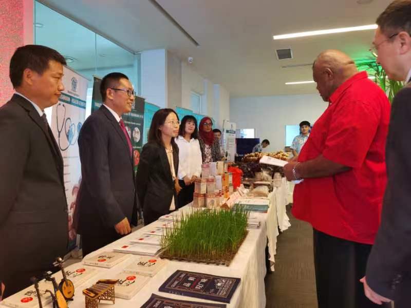 援斐济北岛三期农业专家组应邀参加招待会并设立展台。在中国驻斐济使馆和农业农村部国际交流服务中心的指导下,专家组精心编写制作了项目宣传册,向与会嘉宾介绍展示一期、二期项目成果及三期项目的愿景目标、工作进展和未来展望。专家组还精心准备了中国杂交水稻品种NP918、NP855和当地品种Star和Cagivou4个水稻品种秧苗展品,展览吸引了许多斐济政府官员、媒体、企业等参会人员驻足观看。
