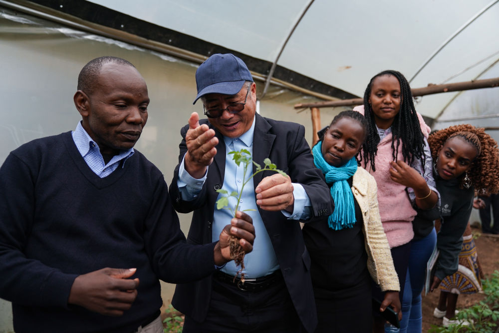 2023年9月18日,在肯尼亚纳库鲁郡举办的中非农业发展和减贫示范村番茄生产培训班上,来自中国的农学教授刘高琼(左二)为肯方学员指导农业技术。多年来,中国农业专家在当地开展了知识培训、技术指导和农业设施修缮等工作,有效助力中国先进的农业技术在纳库鲁地区的示范推广,帮助农民实现增收减贫的目标。