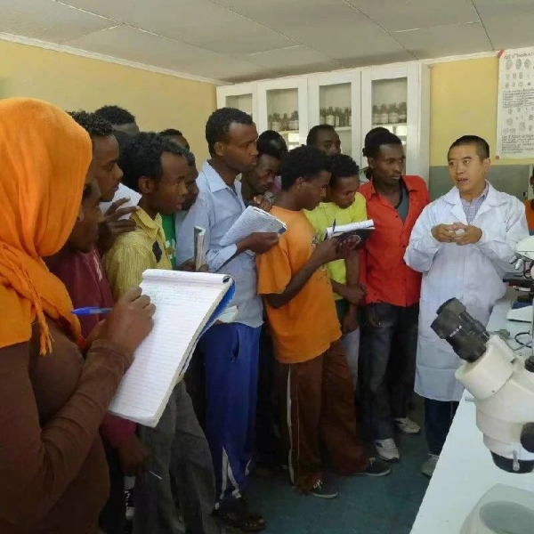 胡小全(右一)在埃塞俄比亚的阿拉格农学院农业职业教育学院兽医系给学生上血液检测课