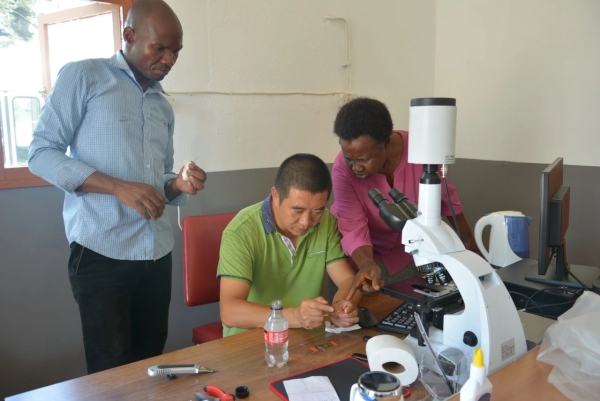 胡小全(中)指导莫桑比克当地专家制备动物精子检测玻片和使用检测系统。张登祥 摄