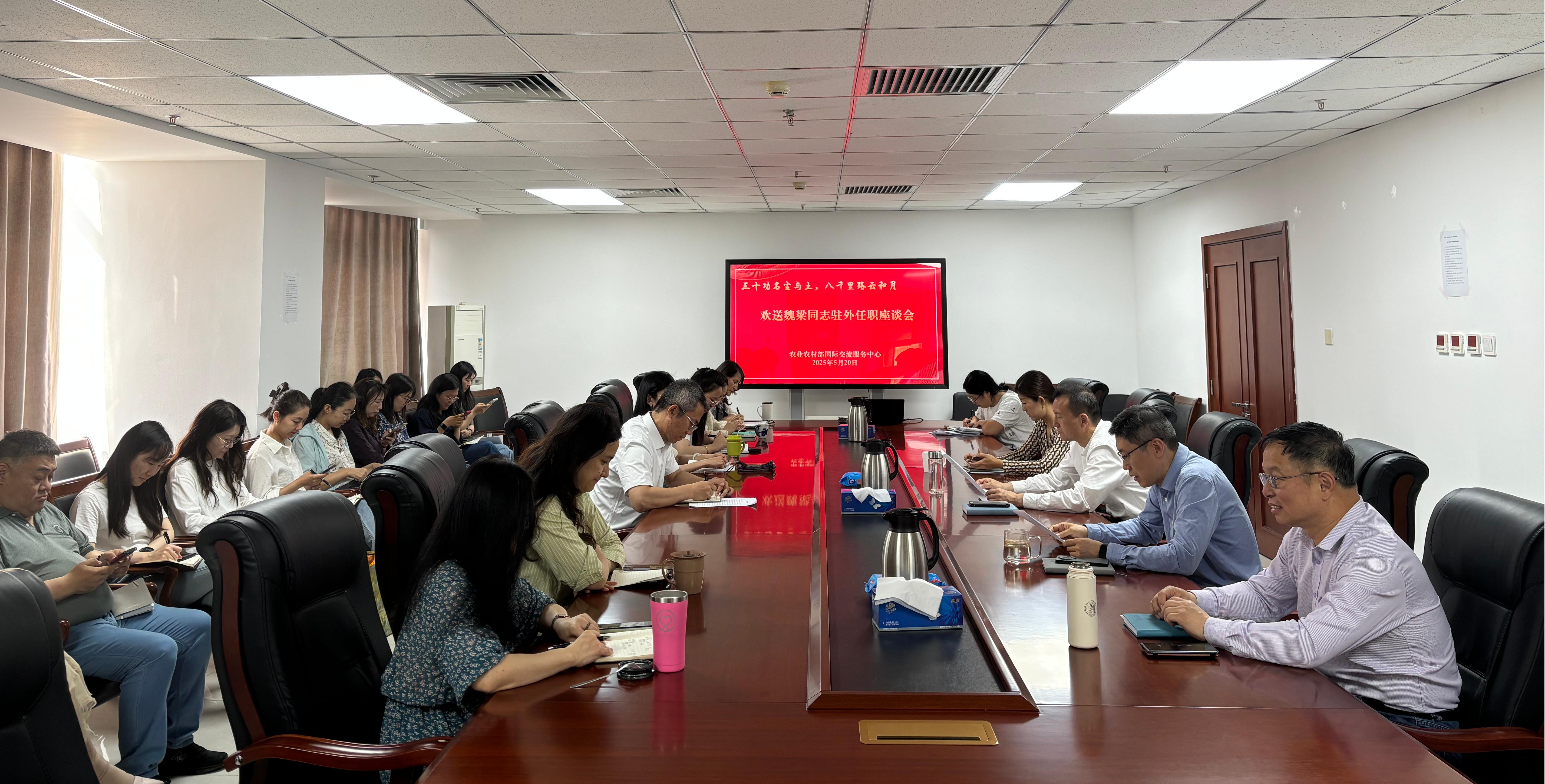 5月20日,农业农村部国际交流中心举办驻外干部出国任职座谈会,欢送魏梁同志赴我驻外使馆任职履新。中心主任顾卫兵出席会议并讲话,全体干部参加。