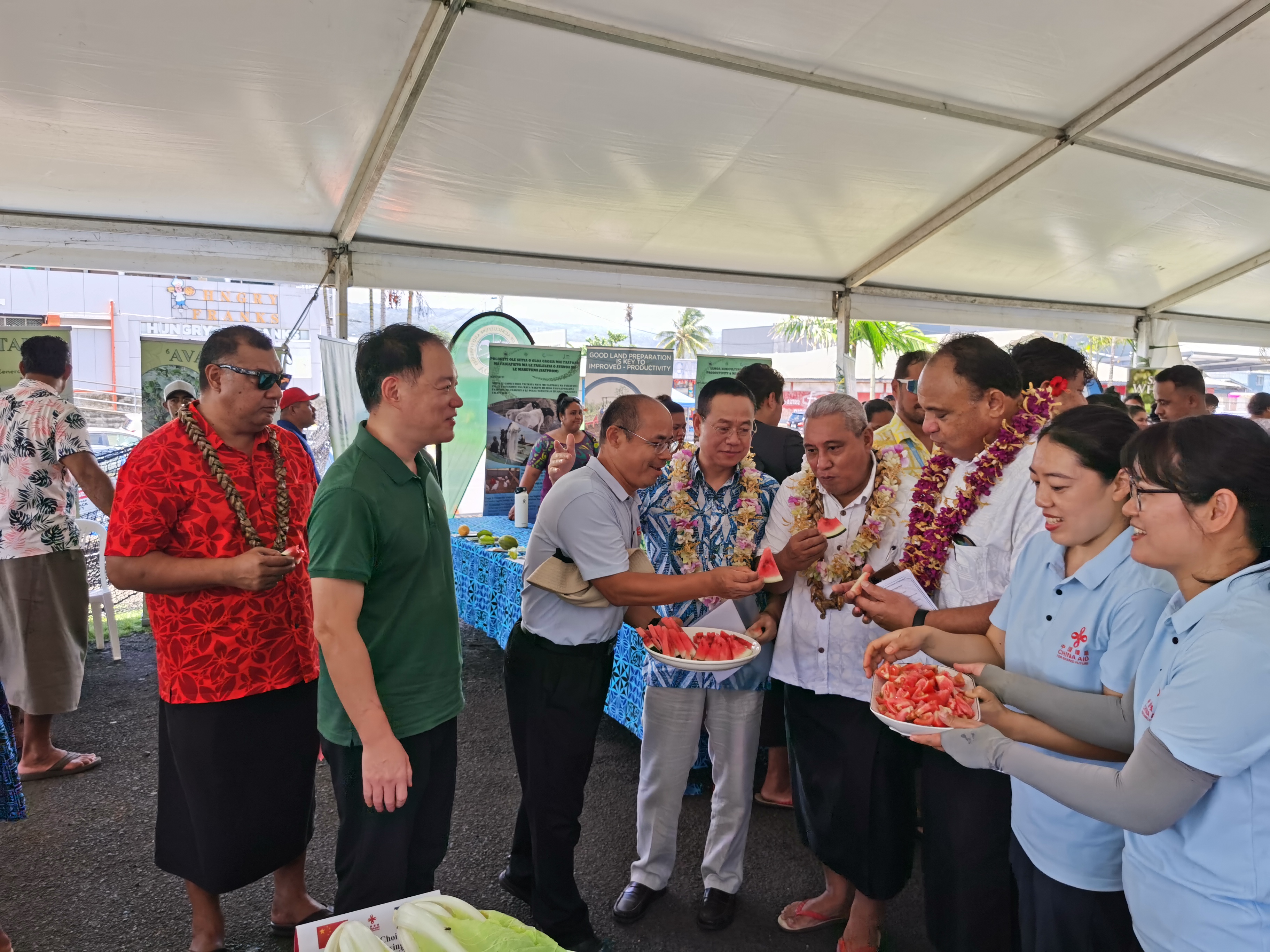 ![]() FAO南太平洋岛屿国家区域办事处协调员屈光洲携参会人员品尝专家种植的西瓜、西红柿 |