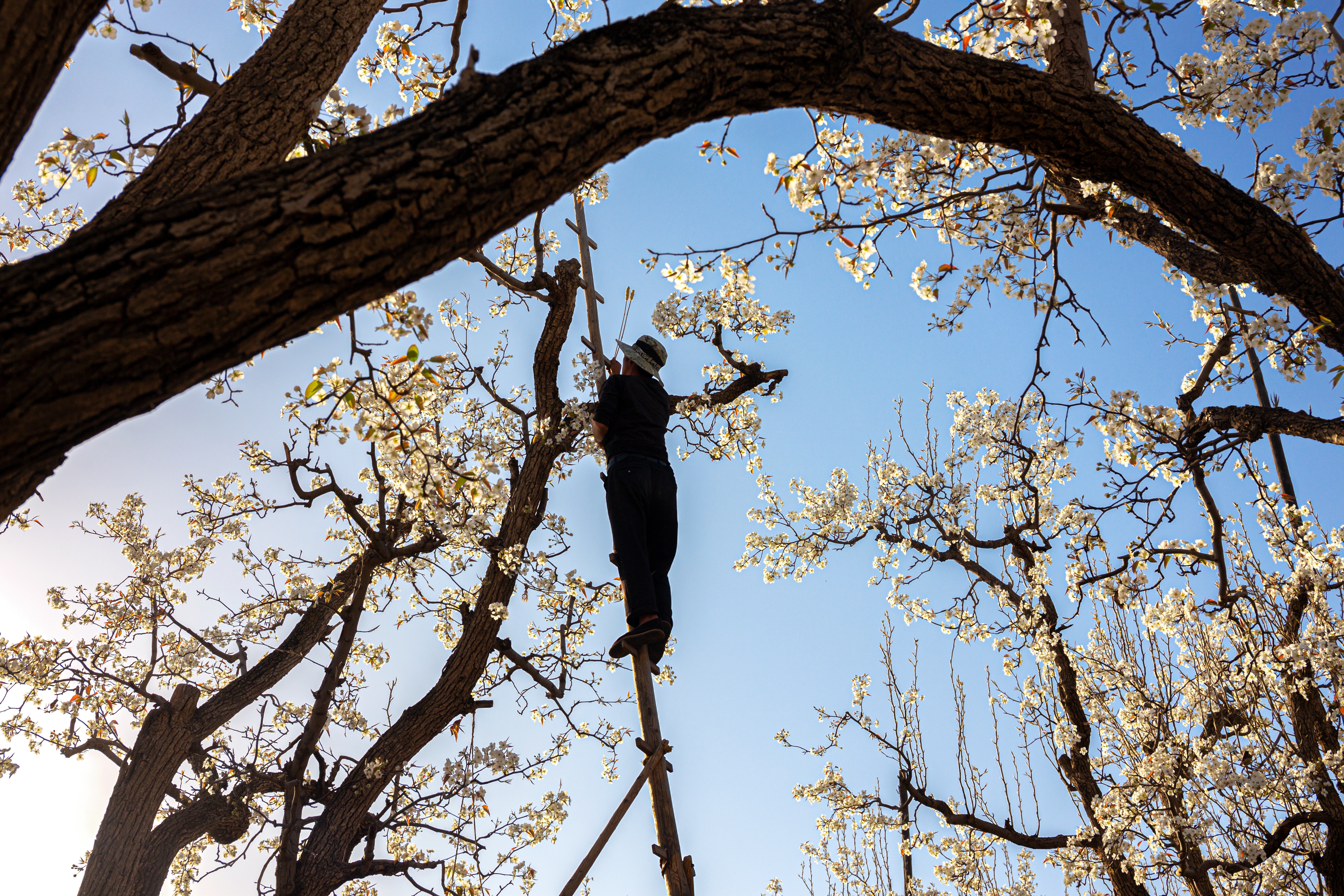 黄河之滨,近万株百年古梨树花开如雪,果香满园。当地果农世代传承独特的“天把式”高田农耕技艺:春季高空授粉,夏季吊枝护果,秋季采摘贮藏,冬季整枝修剪。这种与古梨树相伴相生的生产方式,既保护了古树资源,又传承了黄河之滨独特的梨园文化。