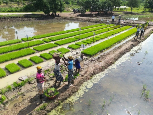 科特迪瓦格格杜垦区的妇女们正在运送秧苗。 天气晴朗,等待丰收的心情也愈发明亮。