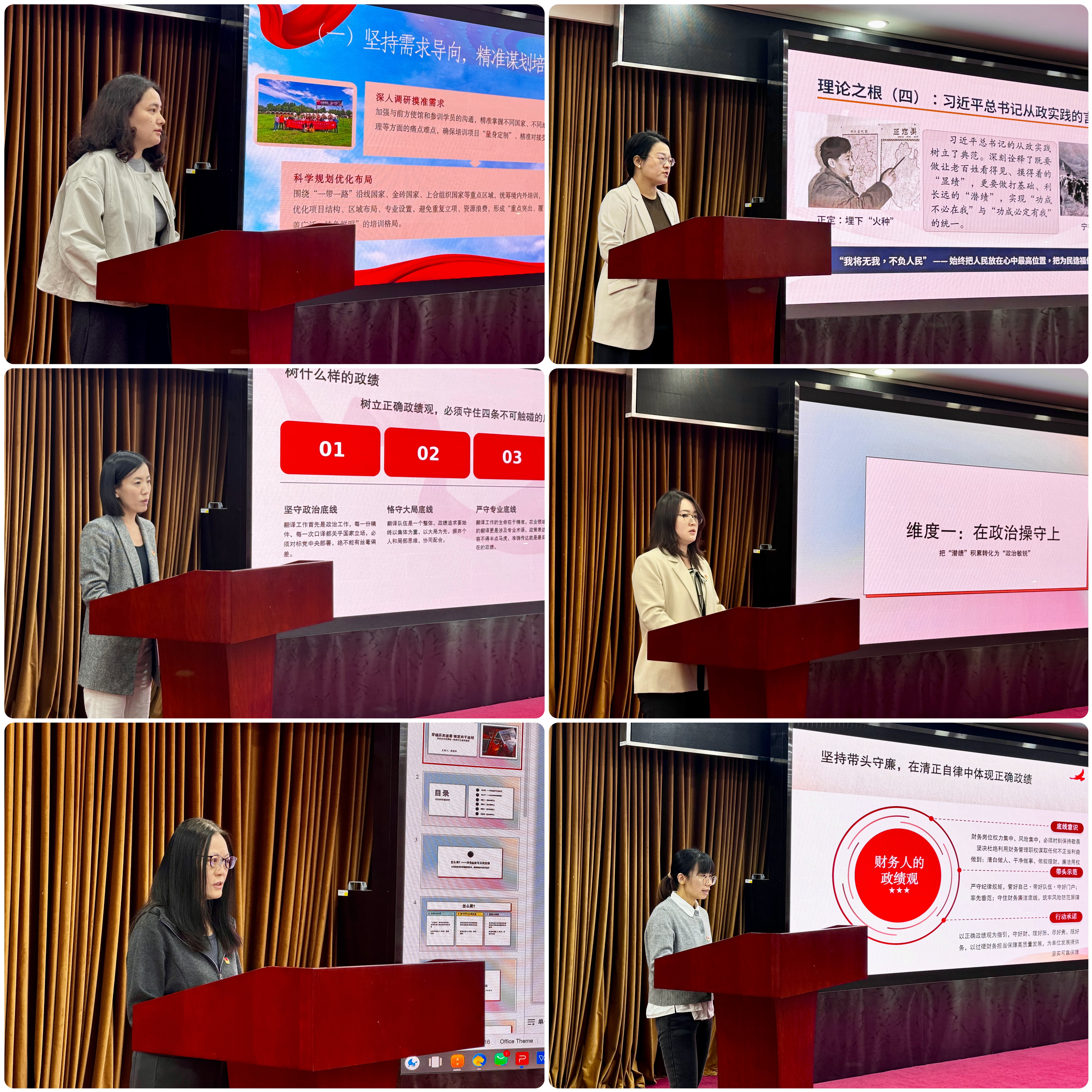 中心第一、二、三党支部推荐的6名处级干部代表从党的百年历史出发,系统梳理正确政绩观的历史脉络、理论渊源和科学内涵,点面结合、声情并茂,展现出了对“怎么看”的深刻理解;紧扣主责主业,立足农业外事翻译、舆情分析、涉外培训、对外援助、财务内控等重点工作,深入剖析权责底线、清晰阐述立场做法,擘画出“怎么干”的清晰蓝图。与会党员踊跃参与交流讨论,纷纷表示将以此次活动为契机,推动正确政绩观内化于心、外化于行,切实把学习教育成效转化为履职尽责的强大动力,奋力为农业农村国际交流合作高质量发展贡献更大力量。