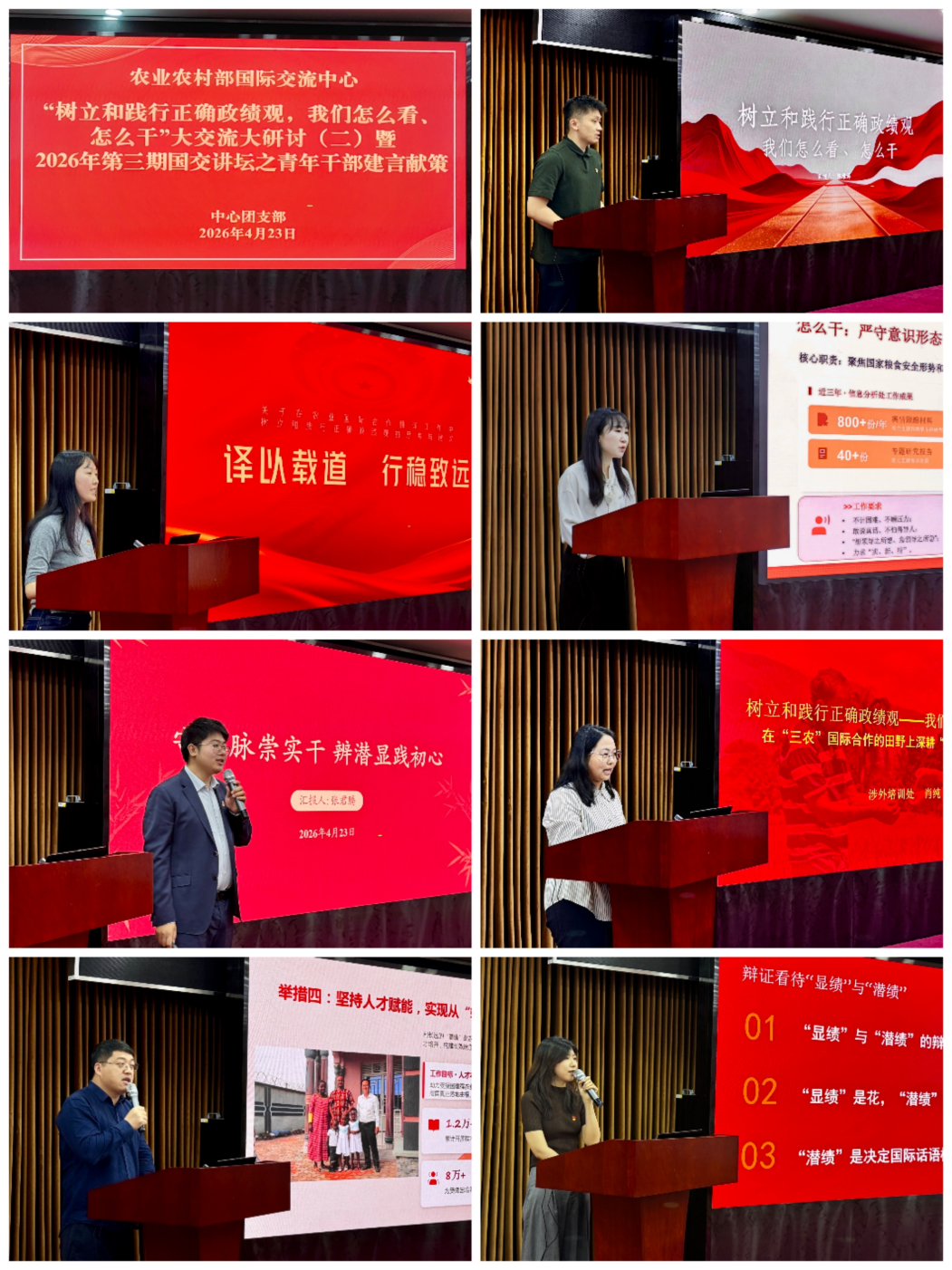 7位来自不同处室的青年干部代表结合岗位实践,围绕农业外事翻译、对外援助、舆情研究、礼宾档案、涉外培训、综合行政等重点工作,畅谈对正确政绩观理论内涵的理解。发言不仅体现了扎实的理论思考,更聚焦服务农业外交全局和中心事业发展,提出了诸多具有建设性的意见与建议,充分展现了新时代青年干部胸怀“国之大者”、崇尚实干担当、积极贡献智慧的良好风貌。
